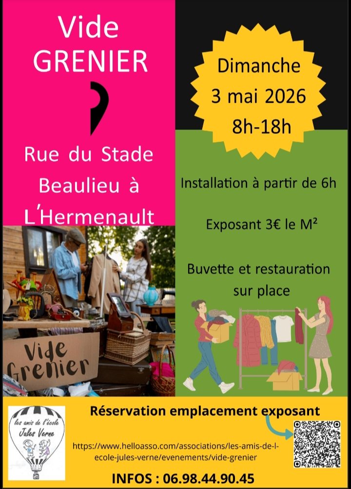 đVide grenier le dimanche 3 mai 2026 organisĂ© par lâĂcole Jules Verne de l'Hermenault.